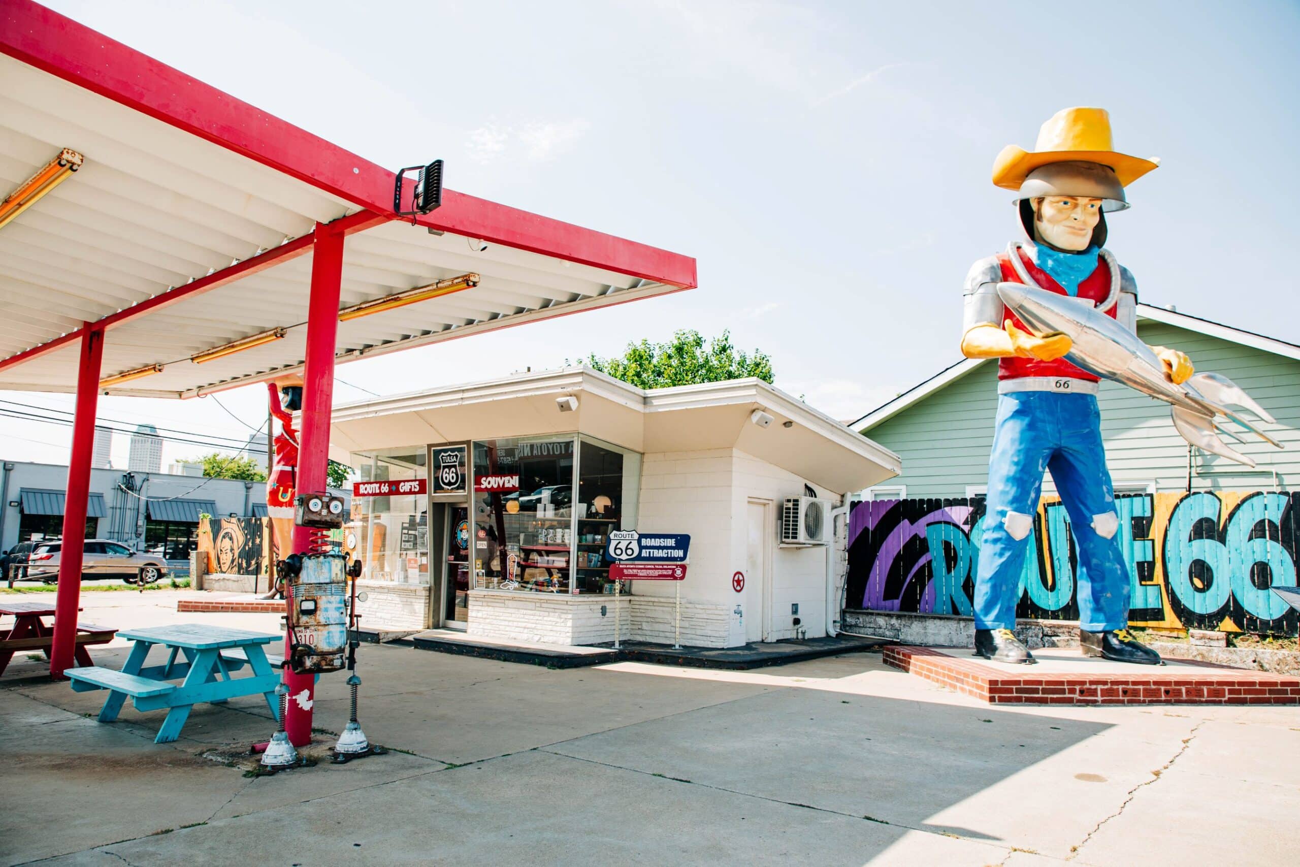We waste no time immersing ourselves in Route 66 history and heritage with lunch at Tally’s Good Food Restaurant in Tulsa, OK! Our afternoon adventure is filled with classic Route 66 roadside attractions from Tulsa’s towering Golden Driller to Buck Atom’s Cosmic Curious, a giant space cowboy statue, with each stop capturing the playful spirit and nostalgic charm of America's Mother Road. We rest in our Tulsa, OK hotel in preparation of our continued adventure tomorrow!